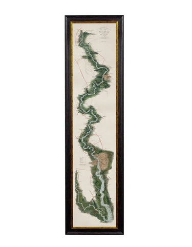 This striking 1.6m tall frame illustrates a complete panoramic view of the river Thames, from its source in Gloucestershire to its estuary in the North Sea. It brings back to life a folded chromolithograph, steel-engraved map of the Thames originally found in the back of an 1840s atlas.